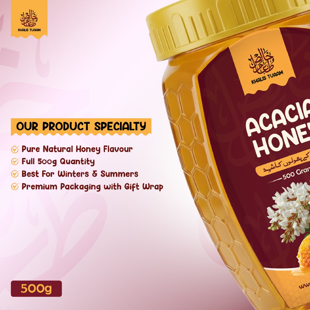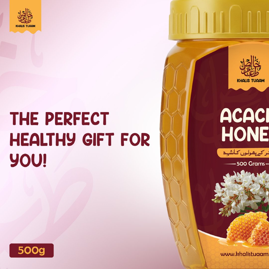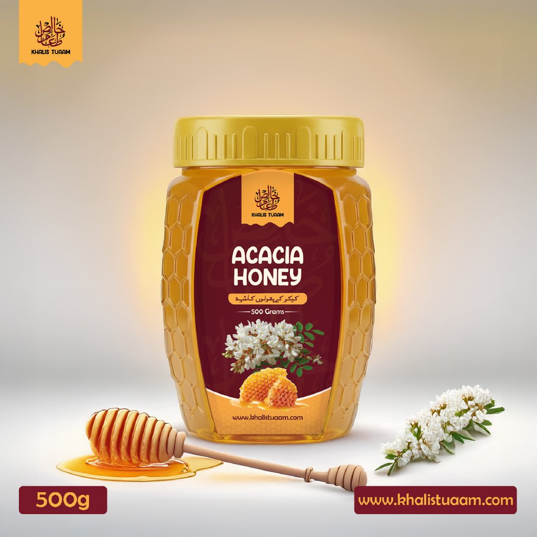 Khalis Tuaam Acacia Honey is a premium, light-colored honey harvested from Acacia tree flowers. Its transparent clarity and mild flavor make it a favorite among those who enjoy gentle sweetness without overpowering taste.
